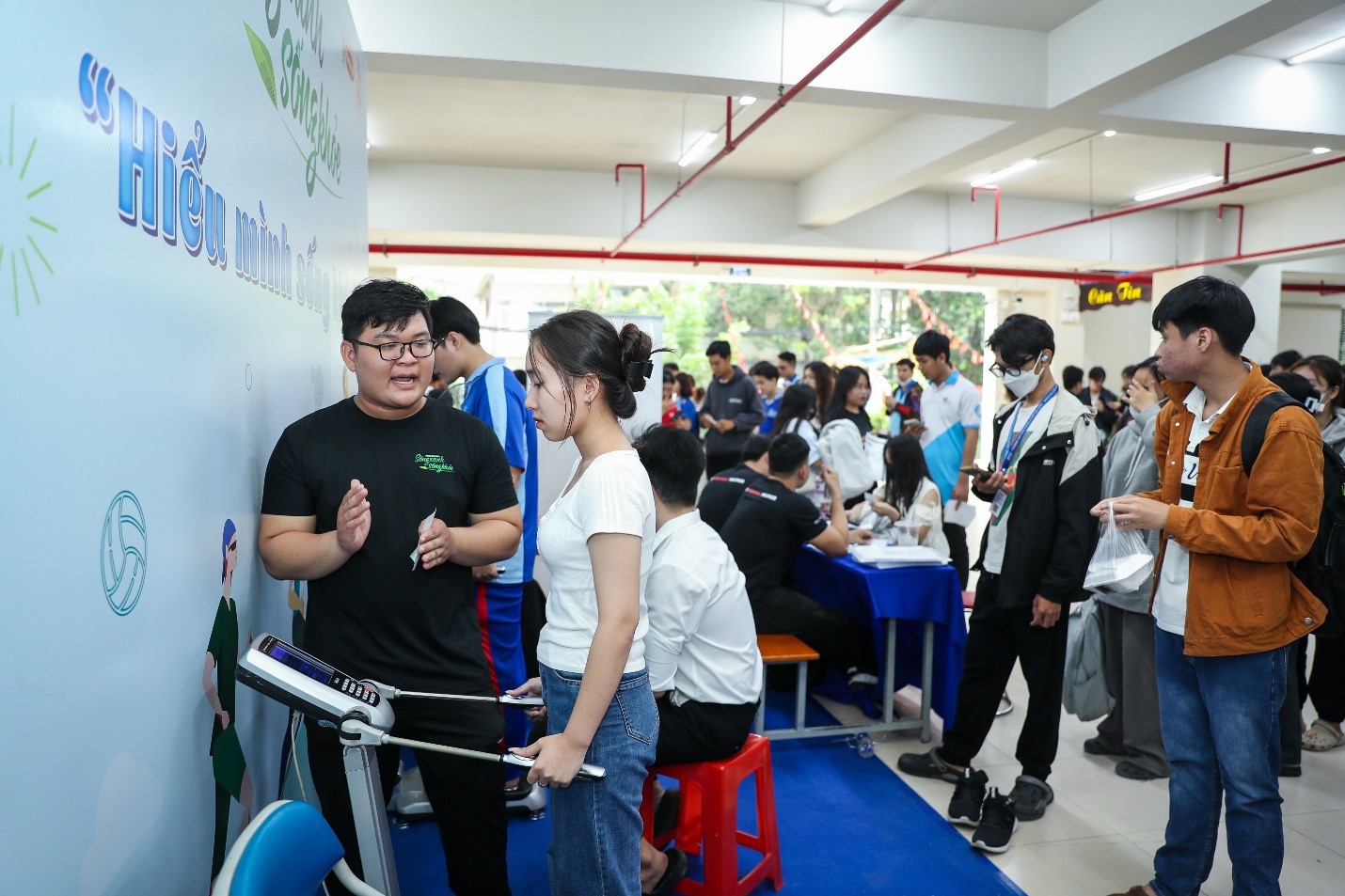 Bên cạnh đó, khu trải nghiệm vận động và check-in “Sống xanh – Sống khỏe” luôn tấp nập với những trò chơi vui nhộn giúp các bạn vừa rèn luyện thể lực vừa lan tỏa tinh thần tích cực. Sinh viên tham gia chương trình còn có cơ hội được kiểm tra chỉ số sức khỏe và nhận về nhiều phần quà cực hấp dẫn.