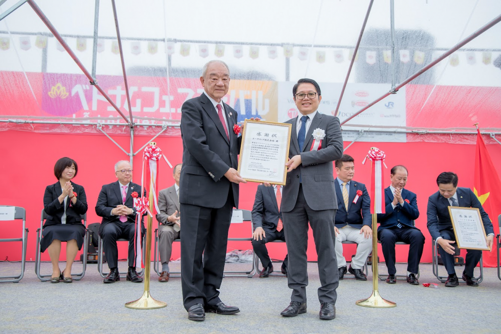 Chủ tịch HĐQT Acecook Việt Nam – ông Kajiwara Junichi (bên trái) nhận thư cảm ơn từ ông Ngô Trịnh Hà – Tổng Lãnh Sự Việt Nam tại Osaka, Nhật Bản