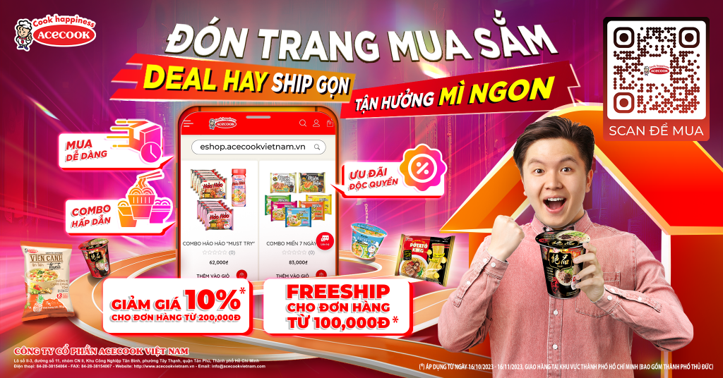 Phòng Marketing – Công ty Cổ Phần Acecook Việt Nam xin trân trọng thông báo ra mắt trang web bán hàng thương mại điện tử mang tên Eshop Acecook Việt Nam từ ngày 16/10/2023, chính thức bán hàng trên khu vực TP.HCM và thành phố Thủ Đức.