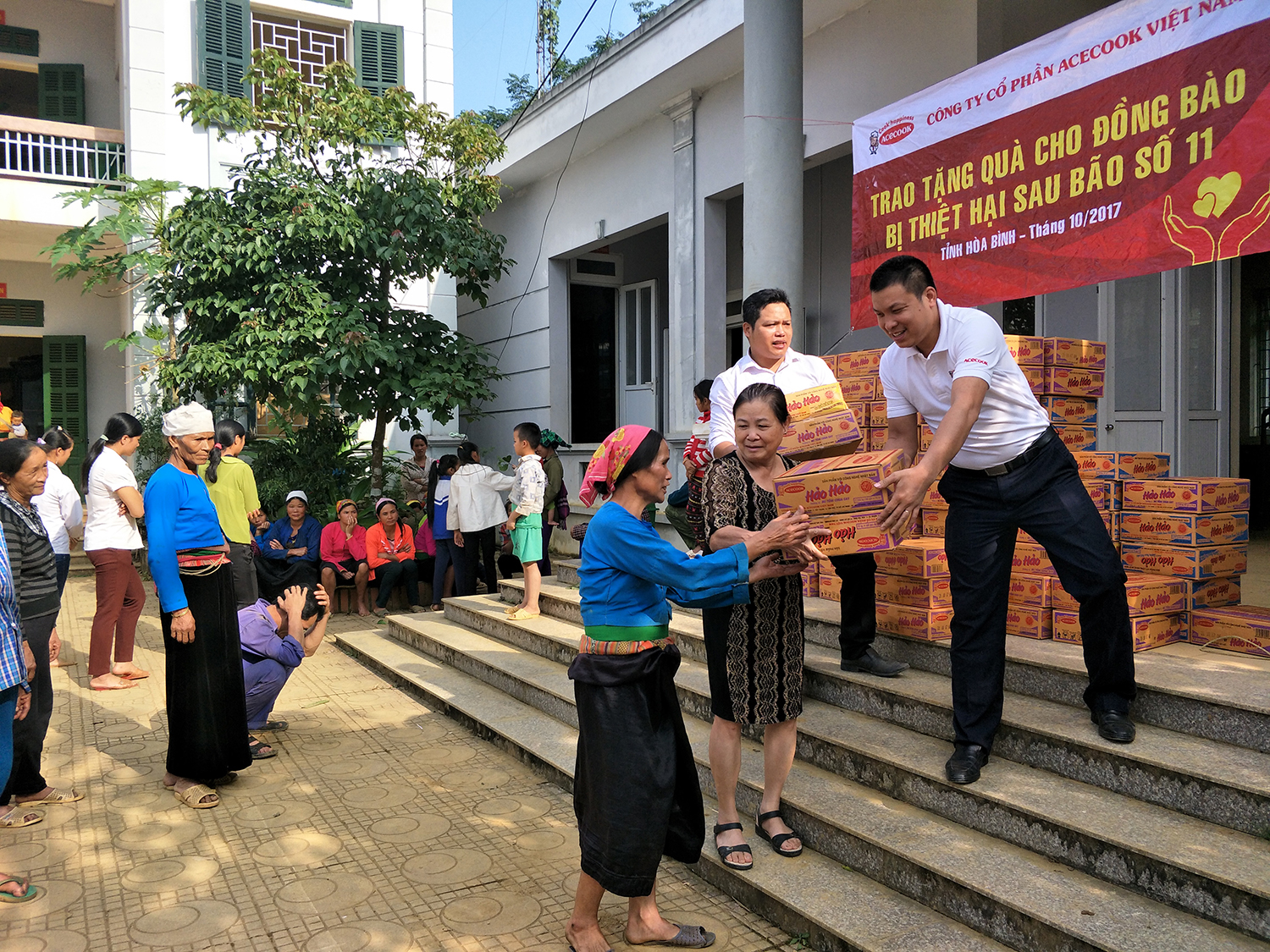 Từ ngày 25/10 ~ 27/10/2017 công ty cổ phần Acecook Việt Nam phối hợp cùng chính quyền các địa phương tiến hành trao tặng 1,600 thùng mì Hảo Hảo đến các hộ gia đình bị thiệt hại nặng nề sau cơn bão số 11 tại 3 tỉnh Thanh Hóa, Hòa Bình, Yên Bái. Số sản phẩm được công ty trao tặng cho các địa phương như sau: