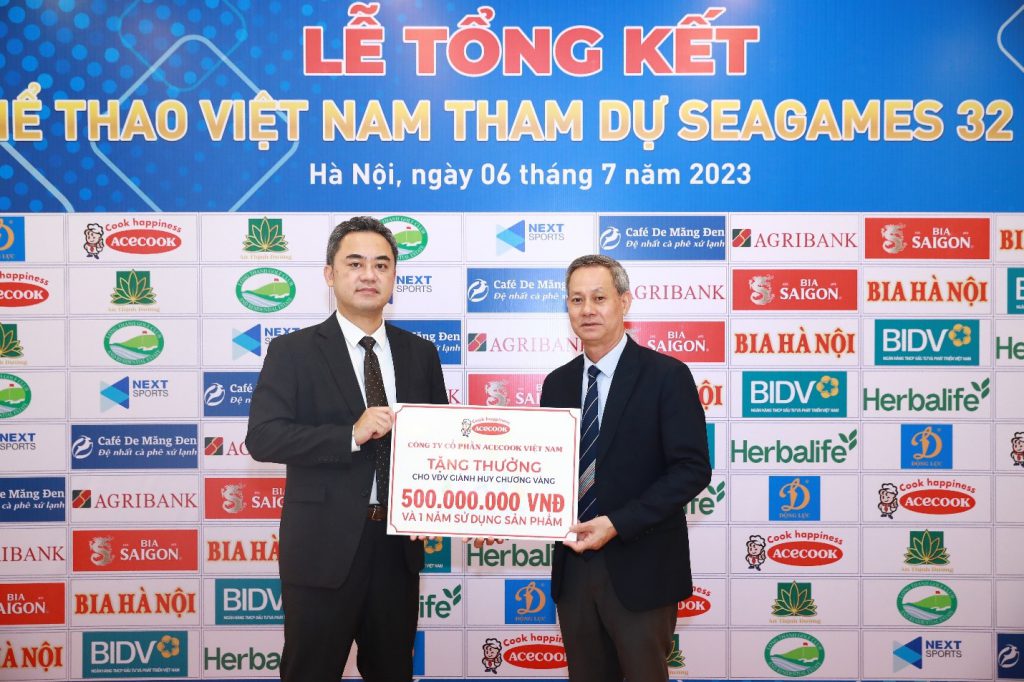 Tại buổi lễ Đại diện Công ty Cổ phần Acecook Việt Nam Ông Kajiwara Shinsuke có buổi gặp mặt, chúc mừng và trao tặng số tiền thưởng là 500 triệu đồng và 1 năm sử dụng sản phẩm của công ty cho các cá nhân, tập thể vận động viên đạt Huy chương Vàng tại SEA Games 32. Với phần quà này tiếp Acecook Việt Nam mong muốn tiếp thêm động lực cho Đoàn thể thao Việt Nam đạt được nhiều thành công vang dội hơn nữa trong các giải đấu trên đấu trường quốc tế trong tương lai.