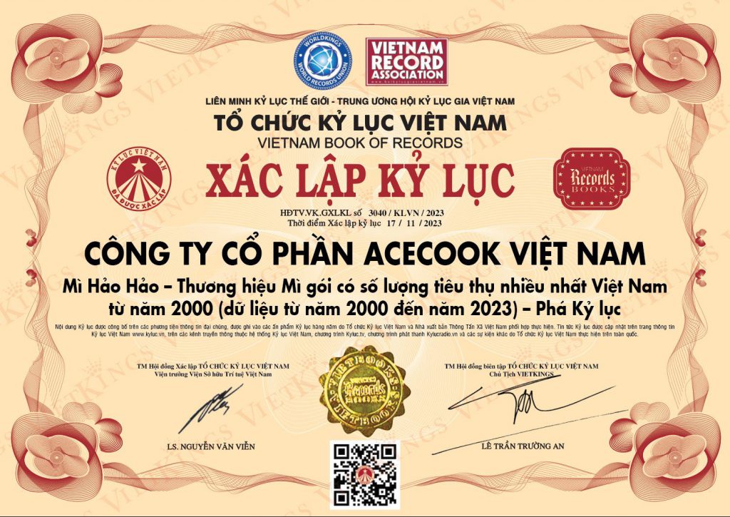 Ảnh: Chứng nhận của tổ chức Kỷ lục Việt Nam cho mì Hảo Hảo tháng 11/2023