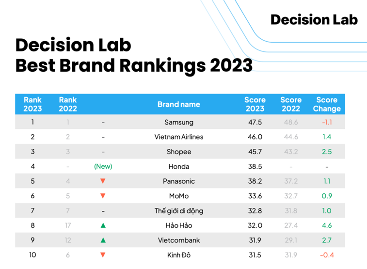 Bảng xếp hạng Thương hiệu tốt nhất Việt Nam (Best Brand Rankings 2022 in Vietnam) được thực hiện bởi Decision Lab, đối tác độc quyền tại Việt Nam của Hãng nghiên cứu toàn cầu YouGov. Bảng xếp hạng dựa trên gần 33.000 cuộc phỏng vấn với người tiêu dùng và được xem là một trong những cuộc khảo sát và đánh giá toàn diện nhất về tiêu dùng tại Việt Nam.