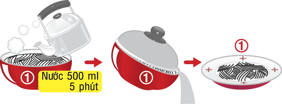 Cho vắt bún vào tô thứ nhất, chế nước sôi vào khoảng 500ml, đậy nắp lại và chờ 5 phút. Mở nắp ra, đảo đều, chắt ráo nước.