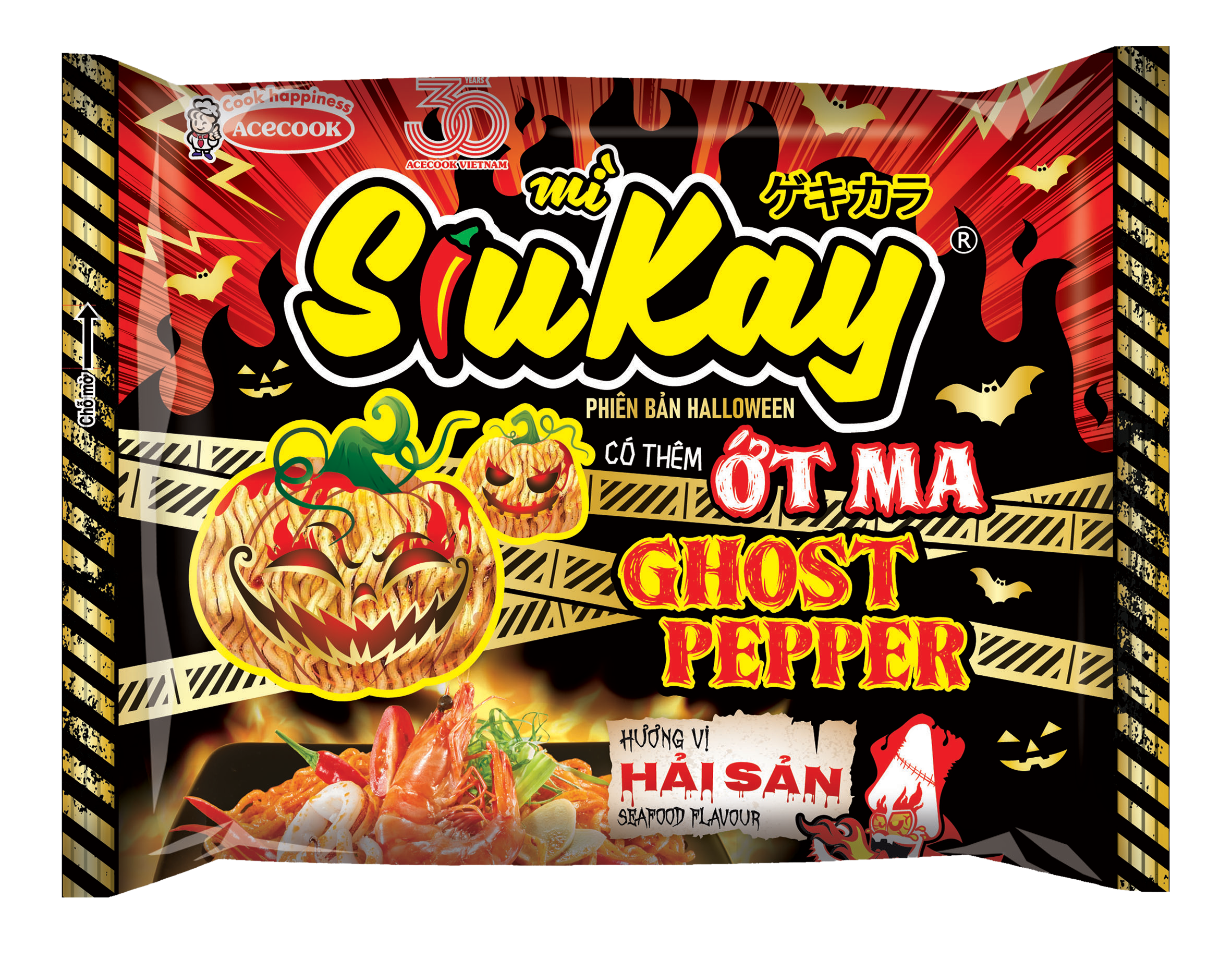 Mì SiuKay phiên bản giới hạn mùa Halloween 2025 mang đến trải nghiệm khác biệt với nước soup đậm đà kết hợp cùng vị cay xé lưỡi từ Ớt Ma – Ghost Pepper trứ danh. Từng gói mì là một thử thách hấp dẫn dành cho các tín đồ đam mê vị cay.