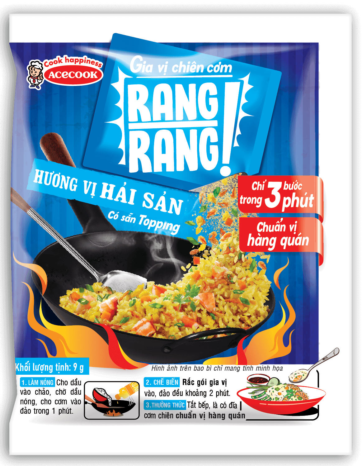 Sản phẩm gia vị chiên cơm tiện lợi có sẵn topping và phần bột có vị ngọt tự nhiên từ các nguyên liệu như hải sản, thịt, cá… Sản phẩm còn giúp tái hiện mùi hương ám khói như được xào trên chảo gang với lửa lớn giống như hàng quán. CHỈ CẦN 3 BƯỚC TRONG 3 PHÚT Những người không giỏi nấu nướng hoặc không có thời gian để chuẩn bị nhiều nguyên liệu thì vẫn có thể làm được món cơm chiên ngon như ngoài tiệm bất cứ lúc nào