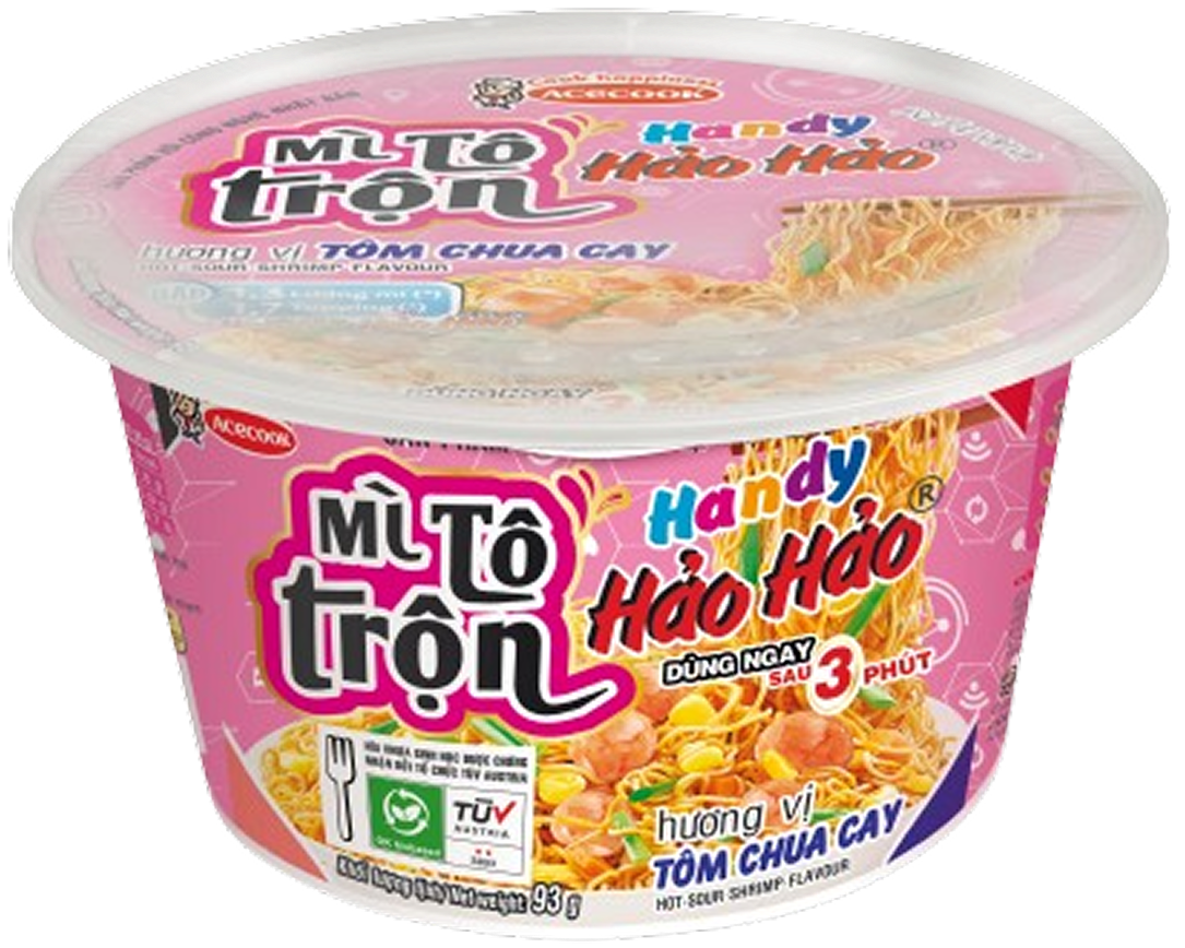 Mì Tô Trộn Handy Hảo Hảo với hương vị Tôm Chua Cay chính thống từ Hảo Hảo (vị chua, cay, ngọt hòa quyện vừa ăn, sợi mì đặc trưng Hảo Hảo), cùng nhiều Topping và lượng mì cho một bữa ăn no. Người dùng vừa có thể dễ dàng có được một bữa ăn đủ đầy như mong muốn mà vẫn tiếp tục các hoạt động giải trí yêu thích của mình. (hương vị quen thuộc, lượng mì gấp 1,3 lần; kayaku gấp 1,7 lần mì ly Handy)