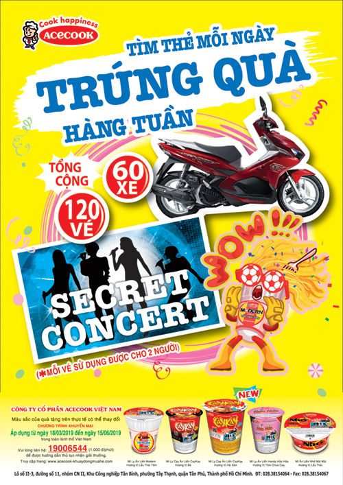 - Công ty Cổ Phần Acecook Việt Nam thông báo chương trình khuyến mại trên website http://www.acecookvietnam.vn, báo giấy và tại tất cả các đại lý, nhà phân phối sản phẩm mì ly khuyến mại trên toàn quốc.