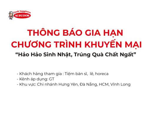 THÔNG BÁO THỰC HIỆN KHUYẾN MẠICông ty Cổ phần Acecook Việt Nam thông báo chương trình khuyến mại như sau:1. Tên chương t