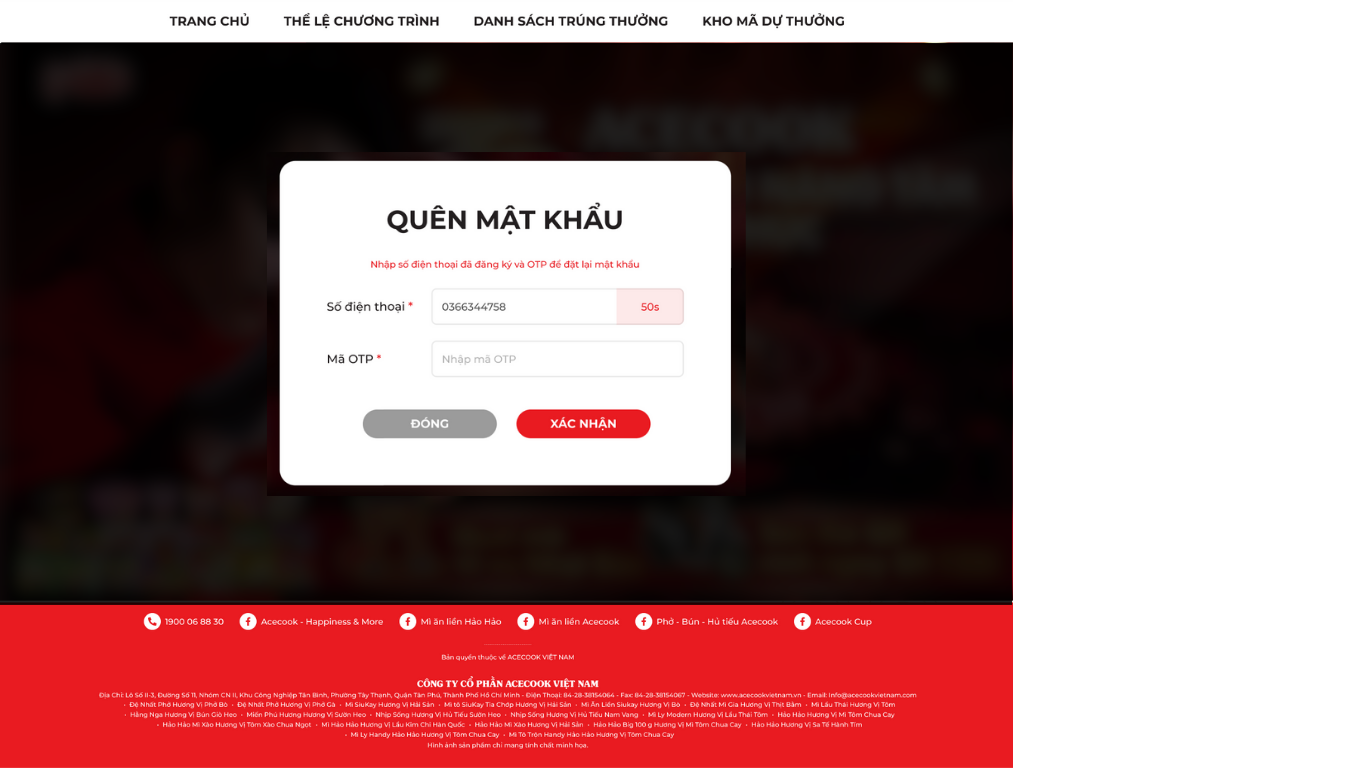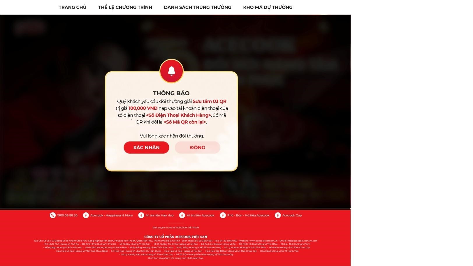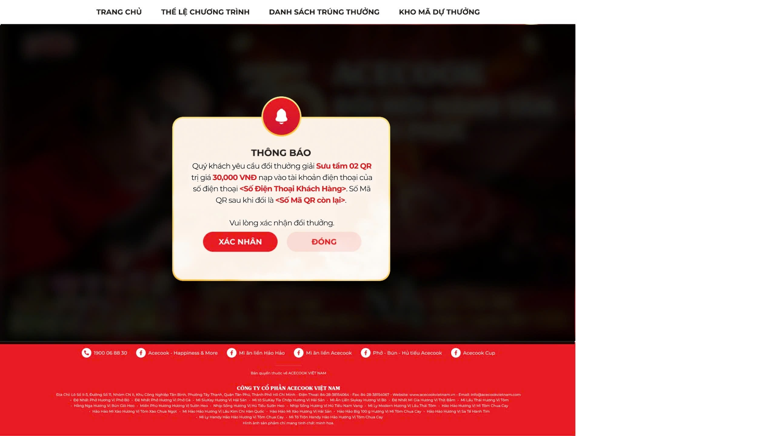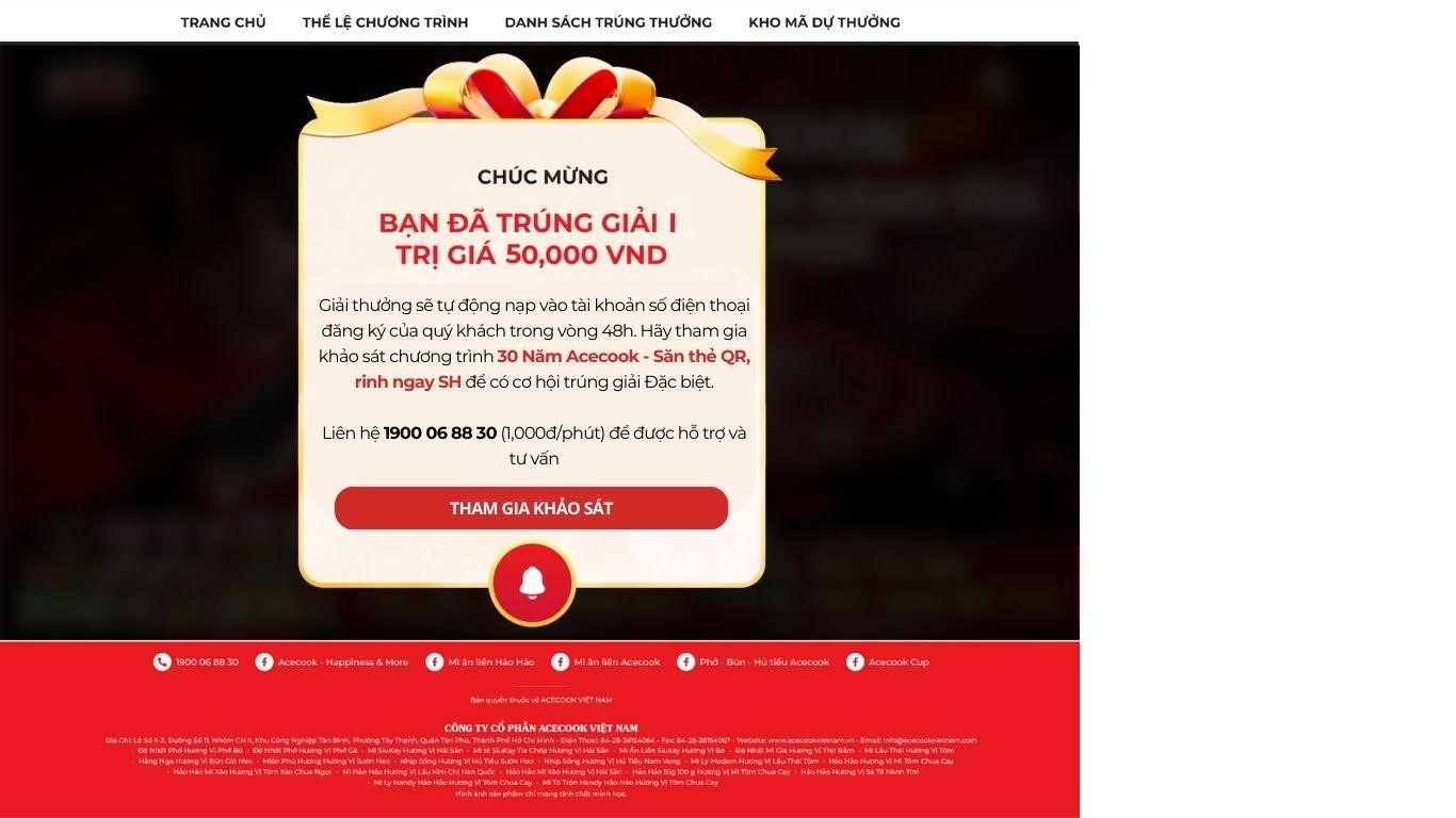 – Công ty Cổ phần Acecook Việt Nam có trách nhiệm công bố kết quả trúng thưởng trên website “https://khuyenmai30nam.acecookvietnam.vn” và Zalo Mini App “Acecook Việt Nam”.