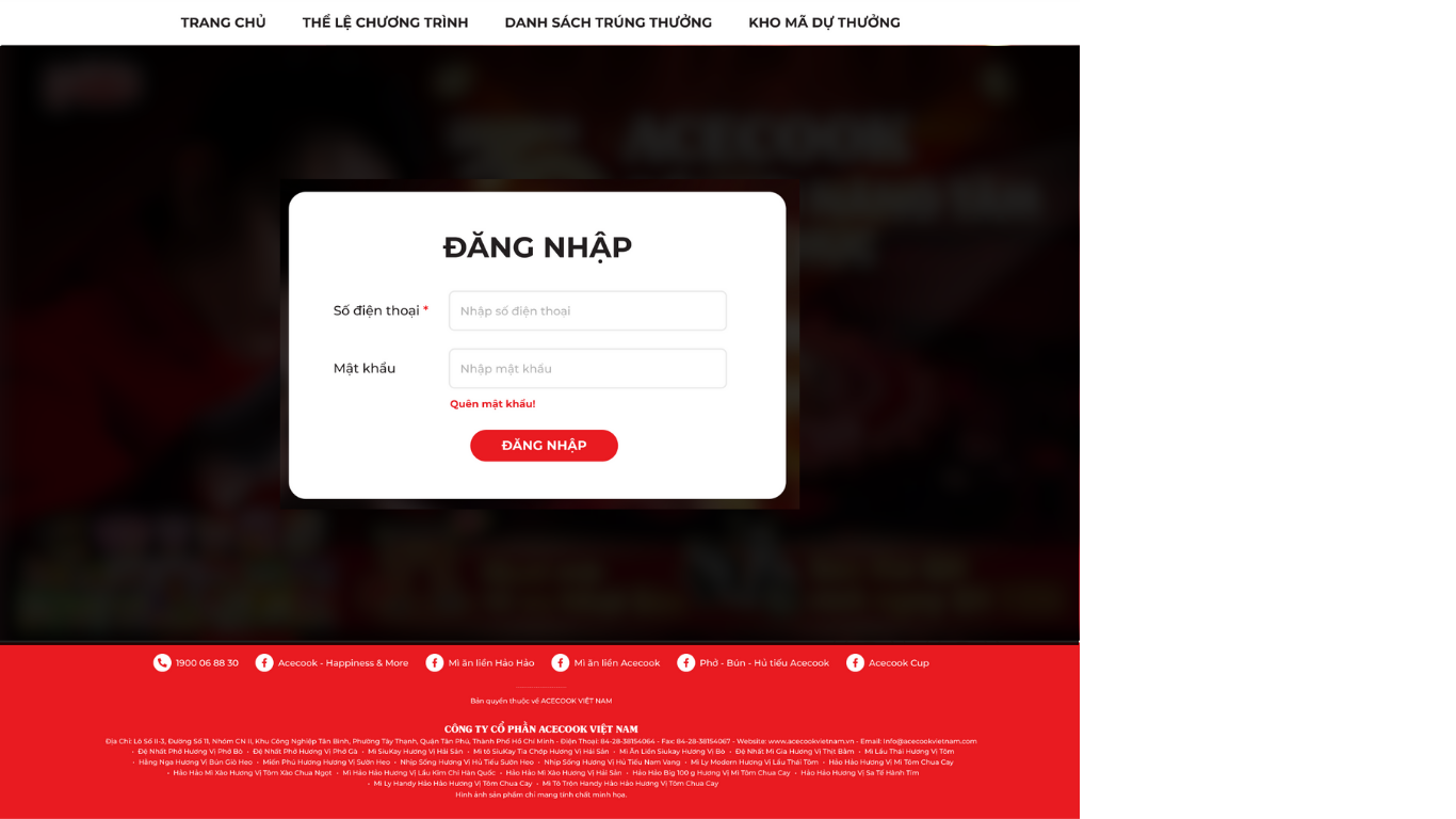 iv. Địa điểm xác định trúng thưởng: Văn phòng Công ty Cổ phần Acecook Việt Nam, Lô số II-3, đường số 11, nhóm CN II, Khu Công Nghiệp Tân Bình, Phường Tây Thạnh, Quận Tân Phú, Thành phố Hồ Chí Minh dựa vào kết quả quay số thông qua phần mềm quay số ngẫu nhiên tại website “https://khuyenmai30nam.acecookvietnam.vn”.