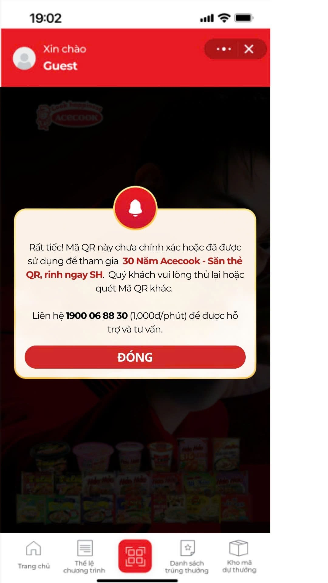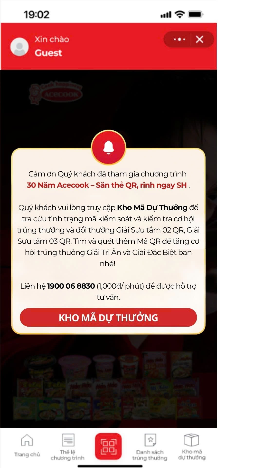a. Trường hợp khách hàng đã đăng ký hoặc đăng nhập Tài Khoản Khách Hàng trên thiết bị trước đó, hệ thống ngay lập tức hiển thị màn hình Kho Mã Dự Thưởng. Khách hàng chọn “30 NĂM ACECOOK SĂN THẺ QR, RINH NGAY SH” để kiểm tra mã kiểm soát của thẻ QR được mã hóa và thể hiện trong Mã QR đã được quét trong chương trình khuyến mại này.
