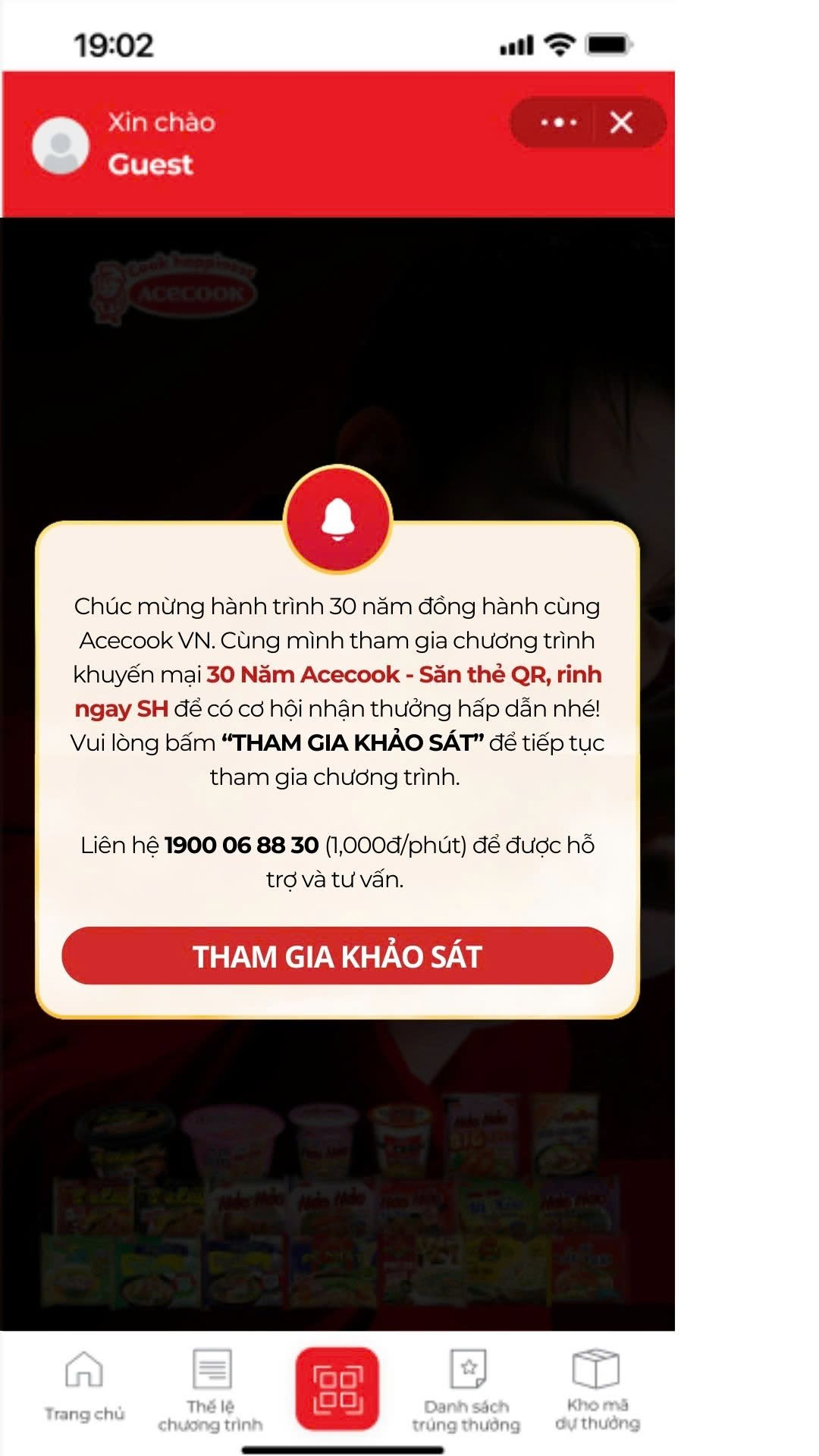 i. Bước 1: Khách hàng bấm vào ô “THAM GIA KHẢO SÁT” được hiển thị trên màn hình hệ thống website “https://khuyenmai30nam.acecookvietnam.vn” sau khi khách hàng quét Mã QR hợp lệ theo Cách 1 Mục 8.4.3 và nhận được thông báo theo Mục 8.4.4 Thể lệ. Hệ thống hiển thị màn hình ngay lập tức để khách hàng tham gia khảo sát.