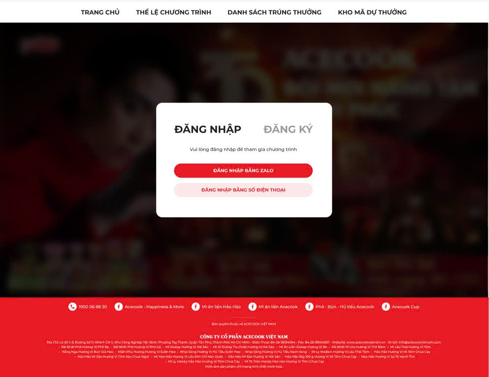 b. Khách hàng truy cập website “https://khuyenmai30nam.acecookvietnam.vn” hoặc Zalo Mini App “Acecook Việt Nam” và bấm chọn “KHO MÃ DỰ THƯỞNG” để truy cập Kho Mã Dự Thưởng.