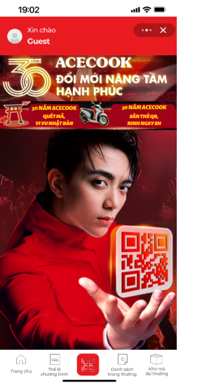 i. Trường hợp khách hàng đã đăng ký hoặc đăng nhập Tài Khoản Khách Hàng trên thiết bị hoặc tài khoản Zalo được đăng nhập trên ứng dụng Zalo đã được khách hàng liên kết với Tài Khoản Khách Hàng thành công trước đó: hệ thống ngay lập tức hiển thị màn hình Kho Mã Dự Thưởng. Khách hàng chọn “30 NĂM ACECOOK SĂN THẺ QR, RINH NGAY SH” để kiểm tra mã kiểm soát trong chương trình khuyến mại này.