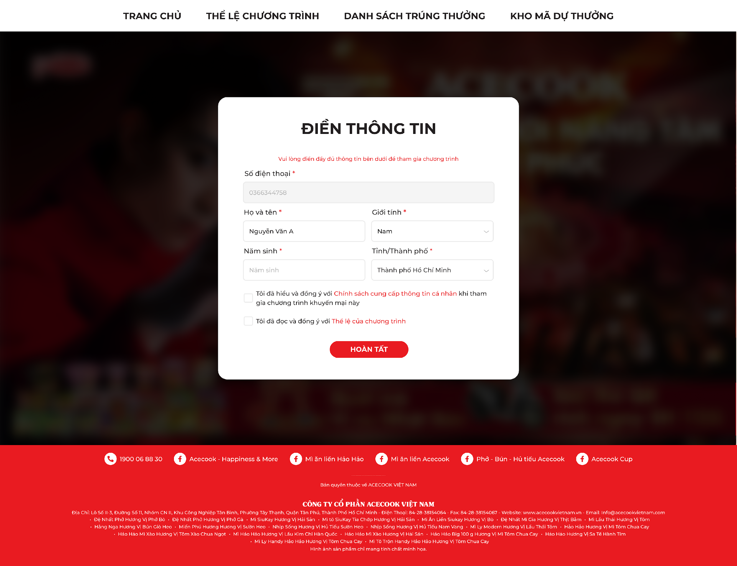– Nếu khách hàng trúng thưởng đồng ý, Công ty Cổ phần Acecook Việt Nam sẽ sử dụng tên và hình ảnh của khách hàng trúng thưởng cho mục đích quảng cáo thương mại.