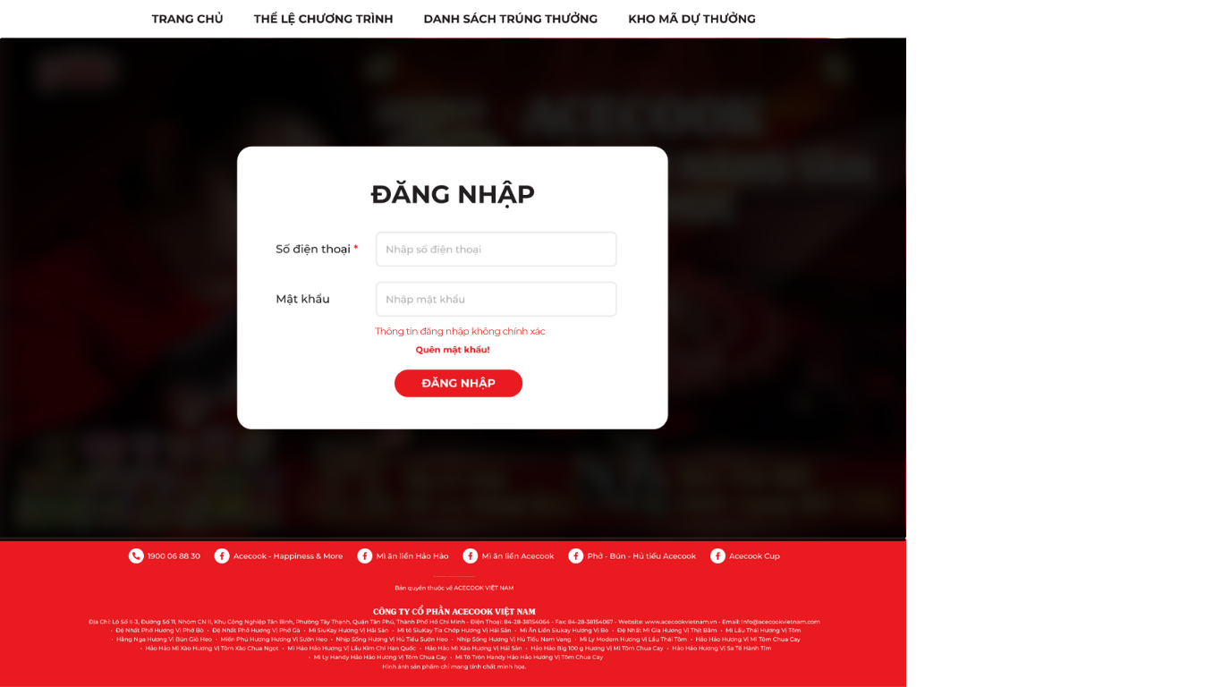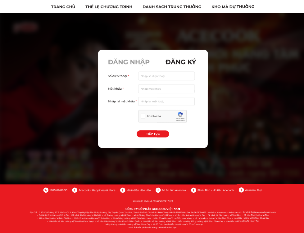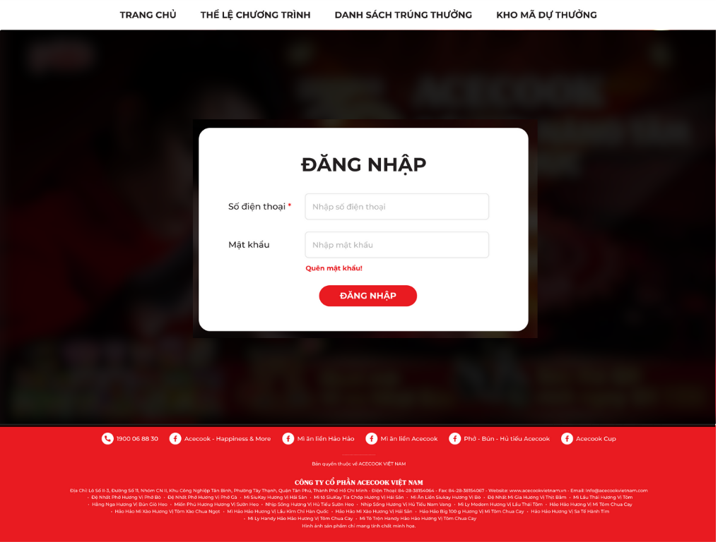 iv. Địa điểm xác định trúng thưởng: Văn phòng Công ty Cổ phần Acecook Việt Nam, Lô số II-3, đường số 11, nhóm CN II, Khu Công Nghiệp Tân Bình, Phường Tây Thạnh, Quận Tân Phú, Thành phố Hồ Chí Minh dựa vào kết quả quay số thông qua phần mềm quay số ngẫu nhiên tại website “https://khuyenmai30nam.acecookvietnam.vn”.