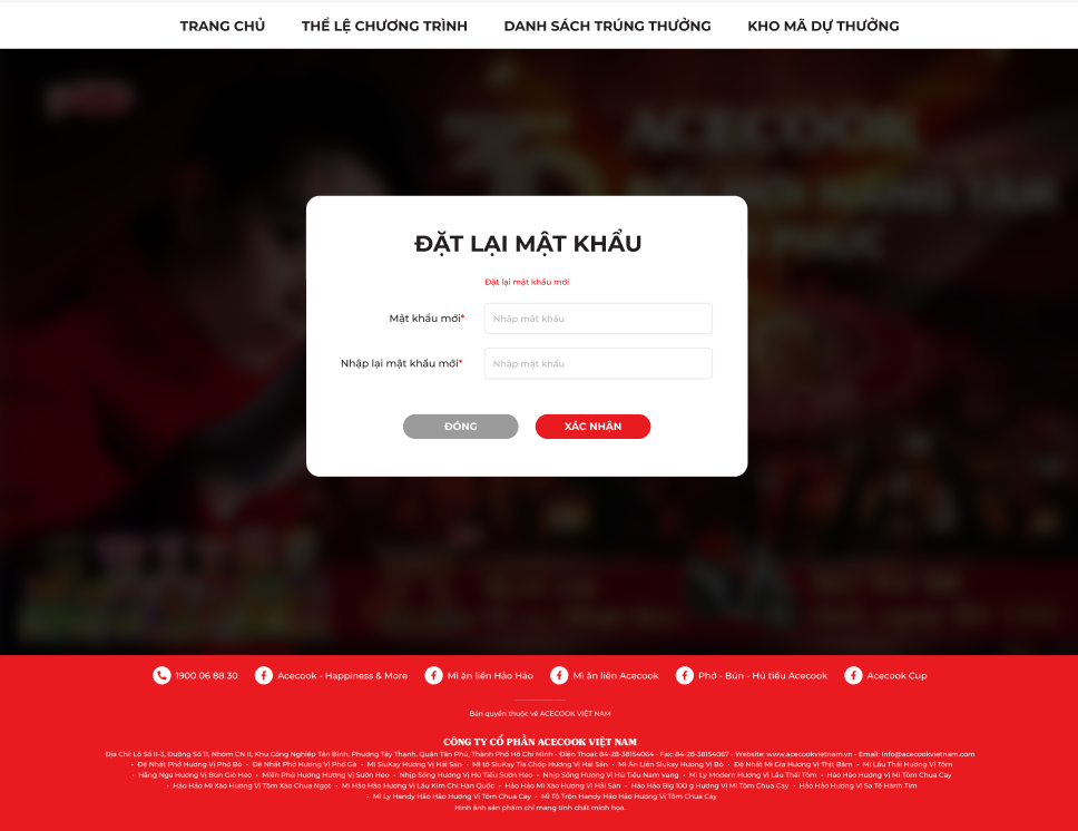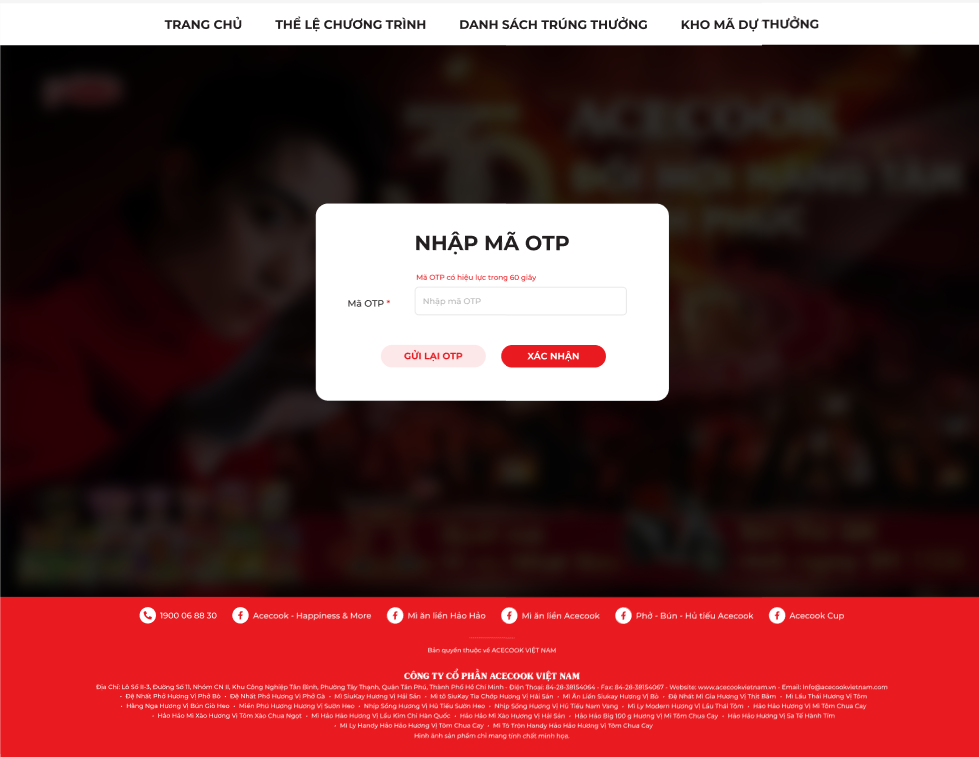 d. Địa điểm xác định trúng thưởng: Văn phòng Công ty Cổ phần Acecook Việt Nam, Lô số II-3, Đường số 11, Nhóm CN II, Khu Công Nghiệp Tân Bình, Phường Tây Thạnh, Quận Tân Phú, Thành phố Hồ Chí Minh dựa vào kết quả thống kê tại website “https://khuyenmai30nam.acecookvietnam.vn” và Zalo Mini App “Acecook Việt Nam”