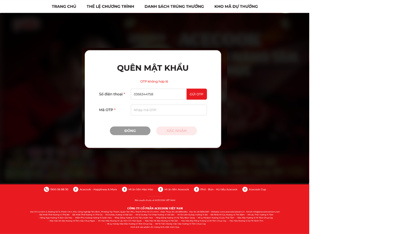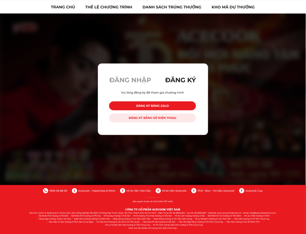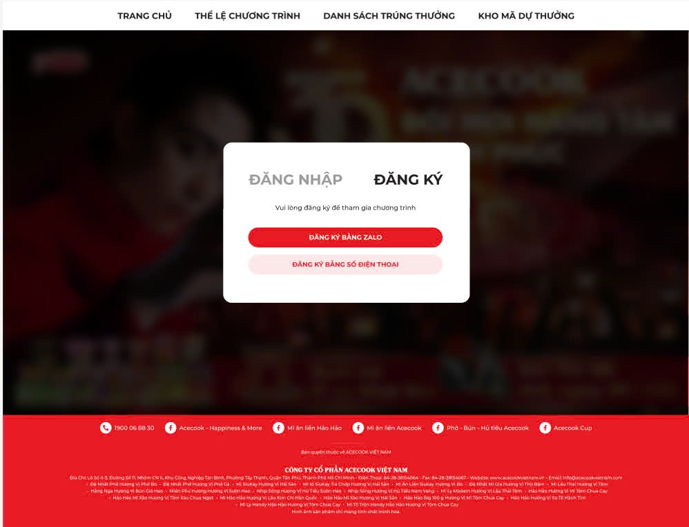 b. Khách hàng truy cập website “https://khuyenmai30nam.acecookvietnam.vn” hoặc Zalo Mini App “Acecook Việt Nam” và bấm chọn “KHO MÃ DỰ THƯỞNG” để truy cập Kho Mã Dự Thưởng.
