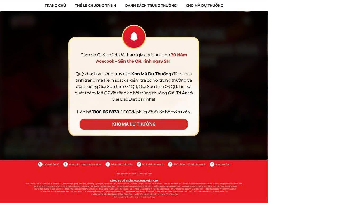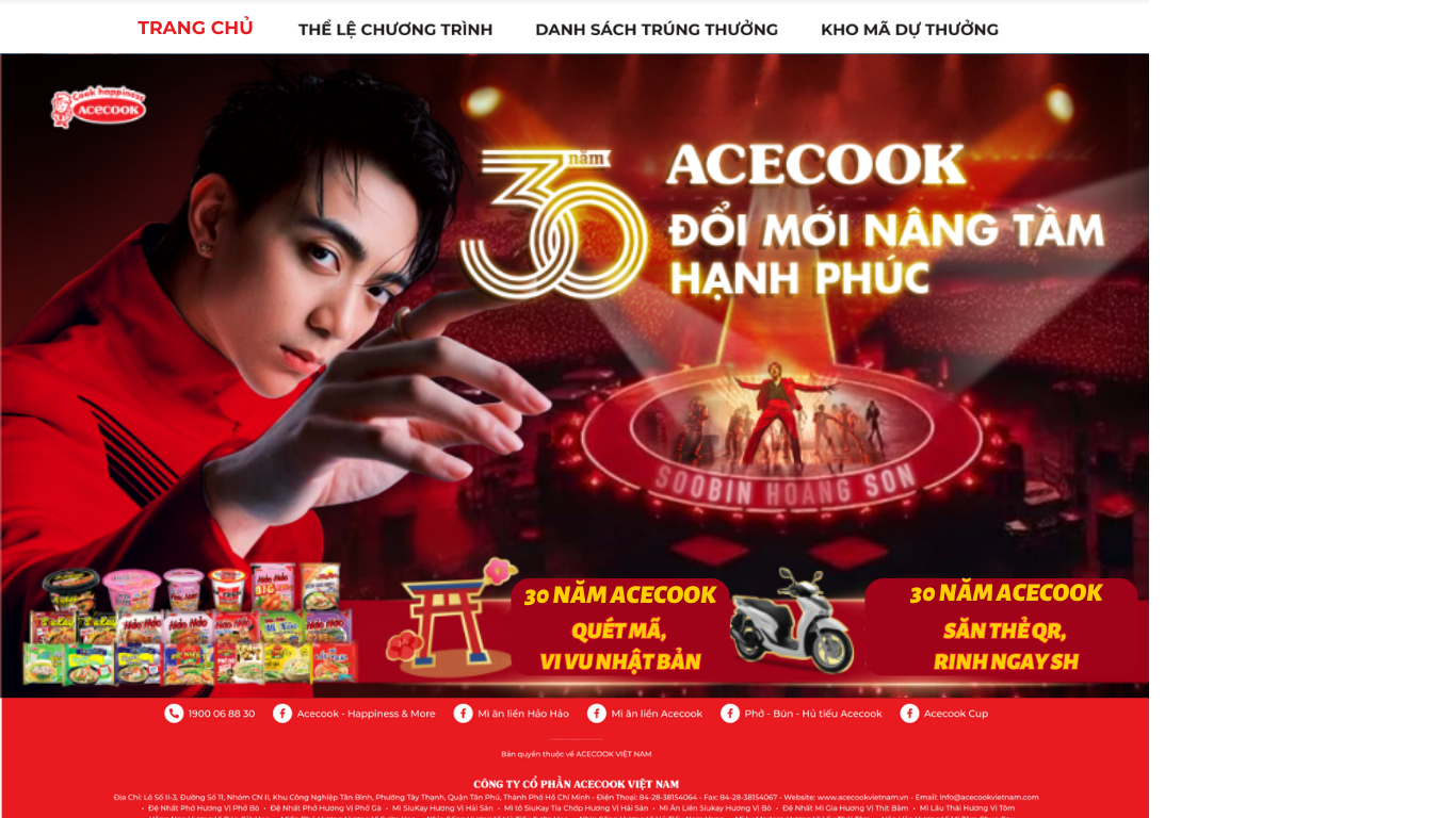 – Công ty Cổ phần Acecook Việt Nam có trách nhiệm công bố kết quả trúng thưởng trên website “https://khuyenmai30nam.acecookvietnam.vn” và Zalo Mini App “Acecook Việt Nam”.