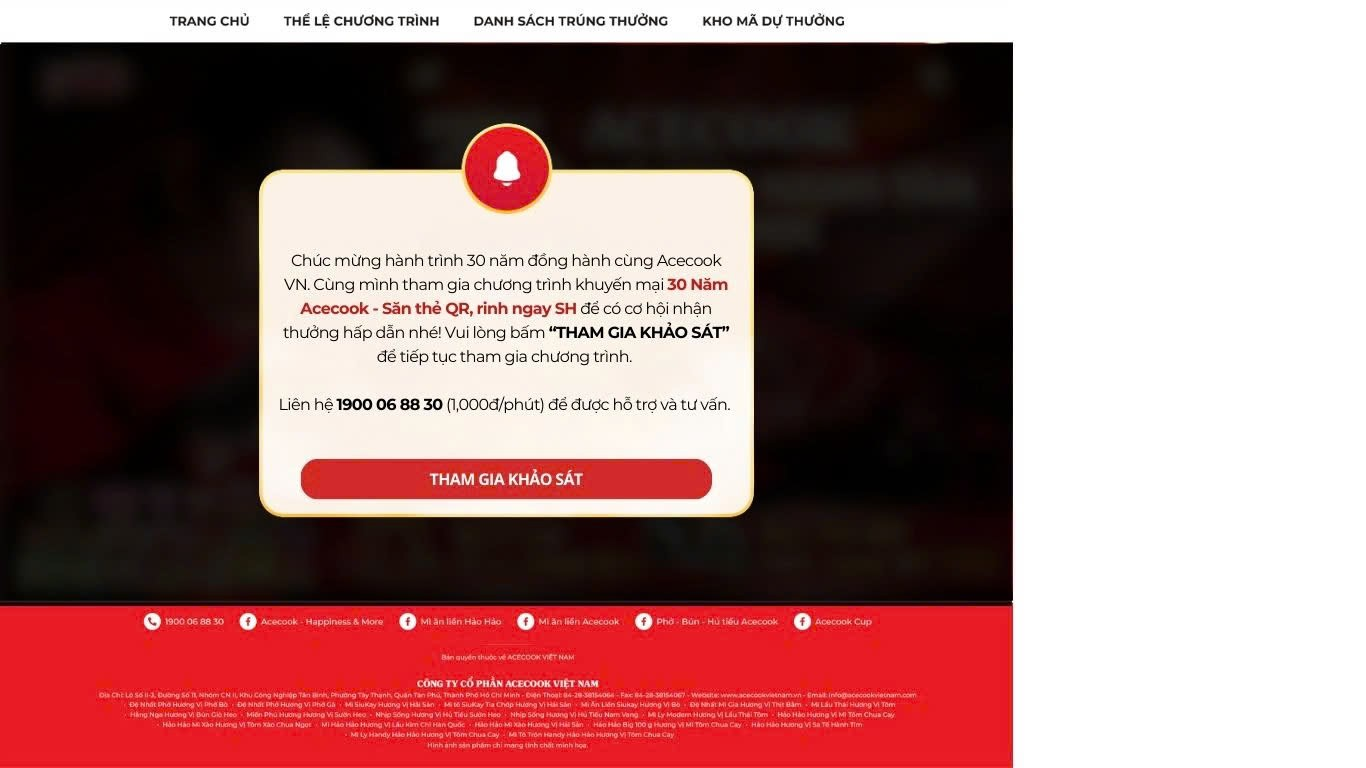 i. Bước 1: Khách hàng bấm vào ô “THAM GIA KHẢO SÁT” được hiển thị trên màn hình hệ thống website “https://khuyenmai30nam.acecookvietnam.vn” sau khi khách hàng quét Mã QR hợp lệ theo Cách 1 Mục 8.4.3 và nhận được thông báo theo Mục 8.4.4 Thể lệ. Hệ thống hiển thị màn hình ngay lập tức để khách hàng tham gia khảo sát.