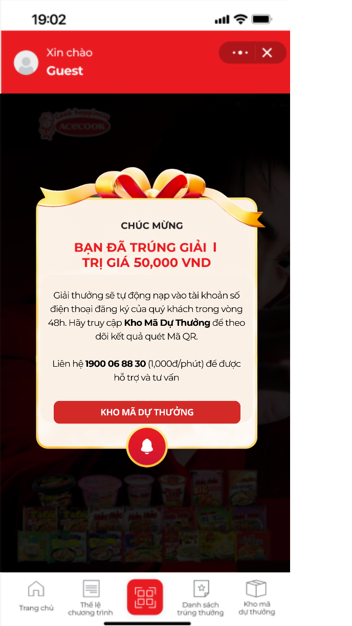 a. Khách hàng quét Mã QR hợp lệ theo 01 trong 02 cách quy định tại Mục 8.4.3 Thể lệ và hệ thống kiểm tra Mã QR chưa được sử dụng thì hệ thống ngay lập tức ghi nhận mã kiểm soát được mã hóa và thể hiện trong Mã QR của thẻ QR mà khách hàng vừa quét vào Kho Mã Dự Thưởng của Tài Khoản Khách Hàng.