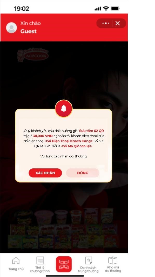 – Khách hàng bấm “ĐỔI THƯỞNG” tại Giải Sưu tầm 02 QR: hệ thống ngay lập tức hiển thị thông báo: “Quý khách yêu cầu đổi thưởng giải Sưu tầm 02 QR trị giá 30,000 VNĐ nạp vào tài khoản điện thoại của số điện thoại <Số Điện Thoại Khách Hàng>. Số Mã QR sau khi đổi là <Số Mã QR còn lại>. Vui lòng xác nhận đổi thưởng.”. Khách hàng bấm “XÁC NHẬN” để xác nhận đổi thưởng hoặc bấm “ĐÓNG” để hủy việc đổi thưởng Giải Sưu tầm 02 QR và quay lại Kho Mã Dự Thưởng.