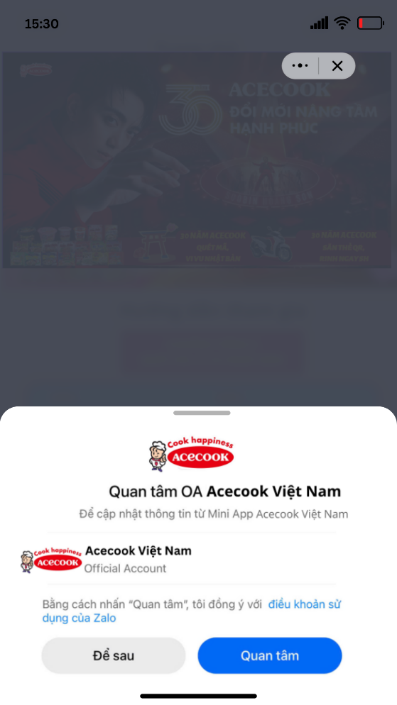 – Công ty Cổ phần Acecook Việt Nam thông báo công khai chi tiết nội dung của Thể lệ chương trình khuyến mại trên website “https://khuyenmai30nam.acecookvietnam.vn”, Zalo Mini App “Acecook Việt Nam” và tại các đại lý, nhà phân phối hàng hóa khuyến mại trên toàn quốc.