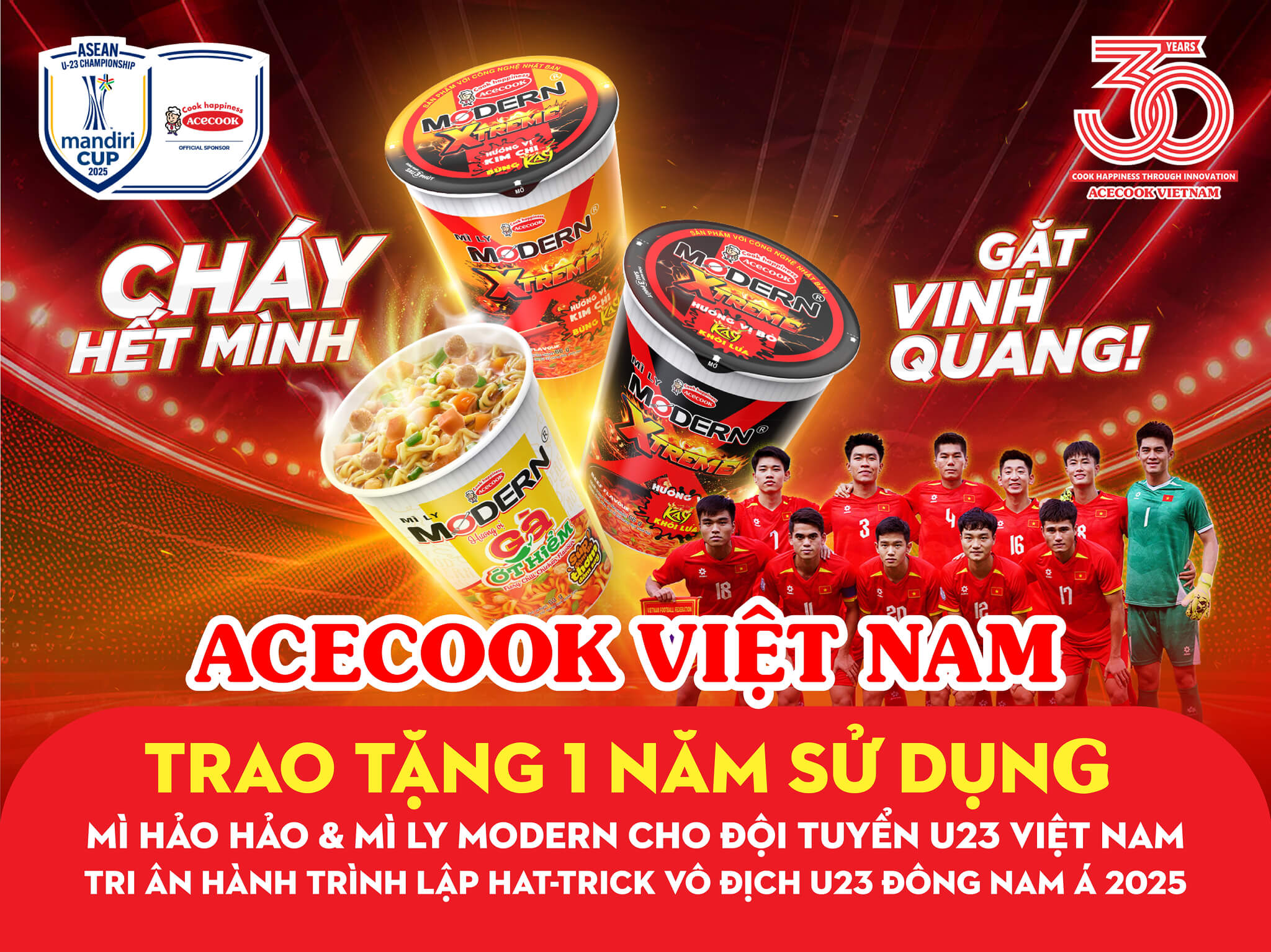 ACECOOK VIỆT NAM TRAO TẶNG 1 NĂM SỬ DỤNG MÌ HẢO HẢO & MÌ LY MODERN CHO ĐỘI TUYỂN U23 VIỆT NAM – TRI ÂN HÀNH TRÌNH LẬP HAT-TRICK VÔ ĐỊCH U23 ĐÔNG NAM Á 2025
